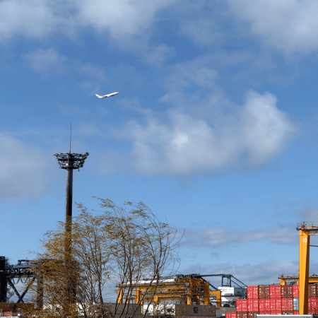 中央防波堤で飛行機の離発着をスマホで撮影する。あまり低空で飛ぶ飛行機はなく、飛び立つ方向もあまり近くではないが、1機だけ近くを飛んだ飛行機を収めた。