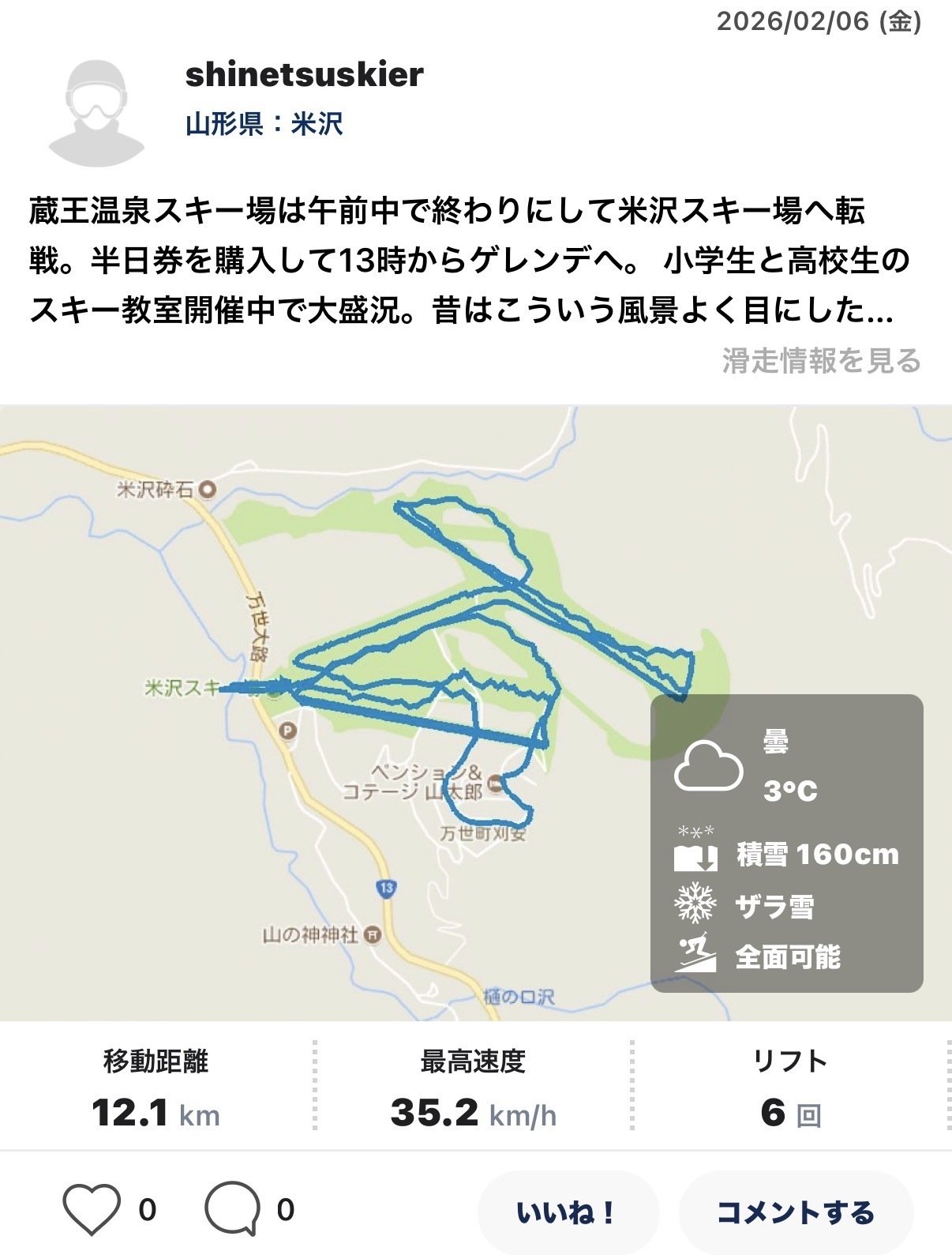 滑走距離12.6km、滞在時間2.6時間、リフト7回