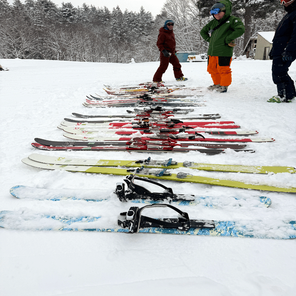 2本目のリフト沿いを滑ると混んでいるので、すぐに3本目のリフトに乗り換えて伝上山の山頂部のコースを何度も滑る。風が強くてうっすら積もった雪はほとんど飛ばされてしまっているが、よく見ると新雪が残った部分がある。そこを主に滑って、ほぼ滑り尽くした。一番急なリフトのすぐ左手下もチャレンジした。午前中最後に非圧雪の高山コースの一つ裏のコース(高山「裏」コースと私は呼んでいる)にチャレンジ。だいぶ滑り尽くされていて新雪はほとんど見つからない。ブッシュもでているが、ボコボコの上下動を強いられる荒れ方ではなかったのが救いだ。このコースはピステンをかけたりするような人手が入っていないので、入り口にはポールでXが3か所作られ、「初級者〜自称上級者まで立ち入り禁止」と看板が雪に刺さっている。「自称上級者」と「上級者」の区別は厳密にはできない、というツッコミはできるが、要するに不整地を滑った経験がどれだけあるのか、ということが違いだと勝手に解釈して滑った。過去に何度も入って地形や景色はわかっている。
