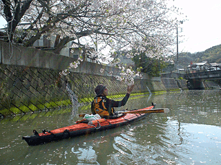 竹岡の白狐川の桜さすがにカサハラ氏を含めて12艇でのツーリングとなるとそれなりに出艇までに時間もかかる。今回は帰りに電車を使うので重量の軽いカフナを組み立てたが、スターンセクションのデッキバーが経年使用で外れてしまっていた。カサハラ氏がその場でワッシャを噛ませて修理してくれた。そして、今回は新しいダブルコーティングのシーソックを試しに使わせていただく。ゴワゴワ感が強いが、ペダルを踏む感覚が大きく変わったようにも思えなかった(ただし、ラダーをつけて操作していたわけではない)。耐久性が増したとのことで、それを取るか、価格を取るか、難しい選択になりそうだ。