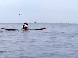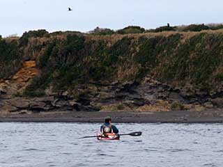 浮島の沖側には回らずに東側を漕いでいたら、勝山沿岸でカヤックフィッシングのおじさんと普通のリジッドカヤックのおじさんに遭遇。少し会話を交わす。リジッドのおじさんに館山まで行くつもり、と告げたら、今日は館山の開港祭りで「にっぽん丸」が停泊しているという。それは人が多いということかもしれないと思ったが、ぜひ「にっぽん丸」を見てみたい衝動にも駆られる。