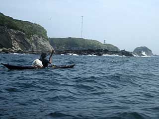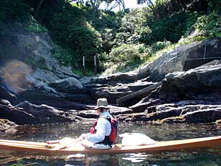 組み上がる頃に南西風が強くなってきた。5m以上ある。鋸山が落ち込む明鐘岬の入り江でロールするつもりなので少々波が荒いが漕ぎ出る。少し沖に出てみると、白波も立つ状況。とりあえず明鐘岬まで3km弱漕いでいくが、風波のうねりが結構高く、頭くらいの高さのものも時折押し寄せてくる。岸近くの磯場では三角波も立っている状況。カサラノの操船練習になるなぁと思いつつ、明鐘岬の入り江へ。さすがに入り江の中は静かだが、西方向に開けている入り江なのでそれなりのうねりは来るし、オンショアの風で漕いでいないと岸に引き寄せられてしまう。