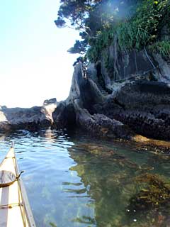 最後にペットボトルや砂をはらんだビニール袋を拾って、11時くらいにやや強めの南西風が吹く中、いつもは通過してしまう城ケ島の北東海岸の「水っ垂れ」をウロウロ。初めてここへは行った。島影の風裏になっていて海水も比較的きれいで、こちらでロール練習してもよかったくらい。帰りは八景原のロックガーデンを縫うように漕いで12時過ぎに終了。