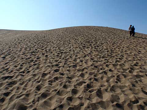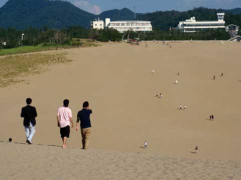 気温36度以上という暑い中での砂丘の上り下りは苦行の一言。便所サンダルで歩くが、足裏に砂が入ると熱い。熱中症に備えて帽子と飲み水は不可欠。砂丘の「馬の背」まで普通の男女が歩いていくので、鳥海山に登れなかったとはいえ、くじけては中年男がすたる。「馬の背」の頂上から海に向かう斜面は、スキーヤーには若干そそるものがあったが、この暑さでは戻ってくるのが辛い。ということでやられないうちに退散。ところが帰りのダラダラ坂が辛かった。