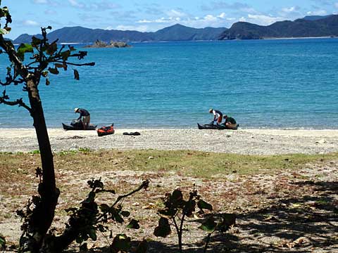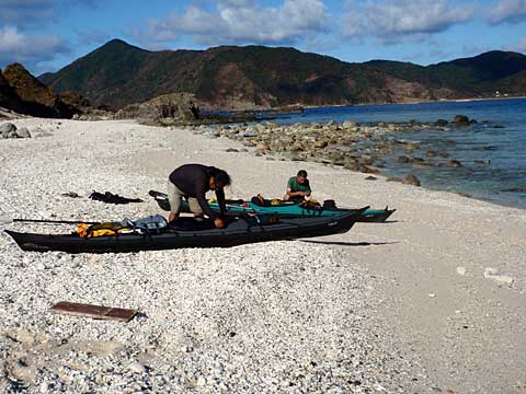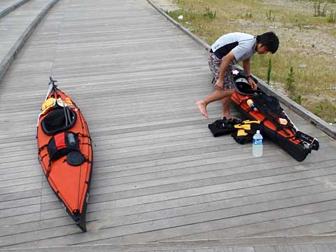 準備中。だいぶ荷物がこなれてきて、カヤックに入れやすくなってきた。