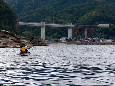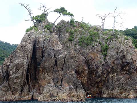 カサラノも順調に組み上がって8時前に出艇。湾口に向かって右手の岸沿いに進んでいくと、南方向からの吹き下ろし風に押されて進む。ダンノ鼻をかすめると右手奥に高浜原発がそびえている。原発関連施設が立ち並んでいるが、そのすぐ左手には音海という普通の漁村があり、この集落も出艇地も、原子炉から2kmも離れていない。若狭湾というのは入り組んだ美しい海岸線に14基もの原発がひしめいているらしい。いま現在は停止状態(←これはまちがいです。8月半ば現在、高浜原発は4基中2基稼働しています)にあるが、こういう特殊な場所を漕ぐのは初めての経験だ。