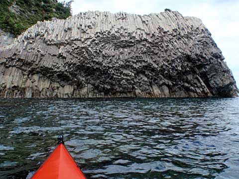 見事な柱状節理。岩の造形も少し漕ぐとだいぶ様相が変化する。