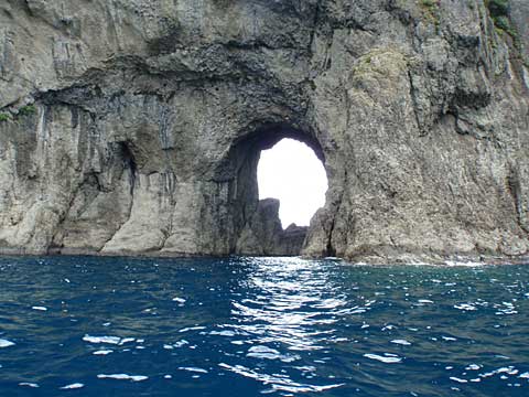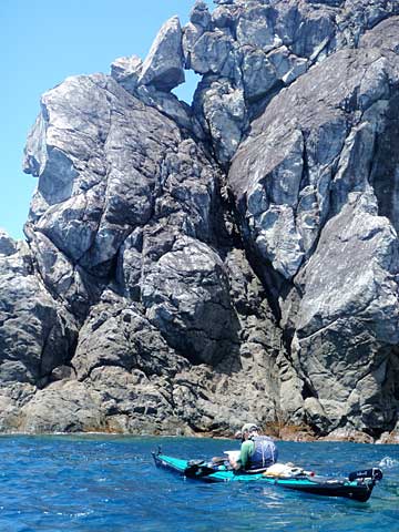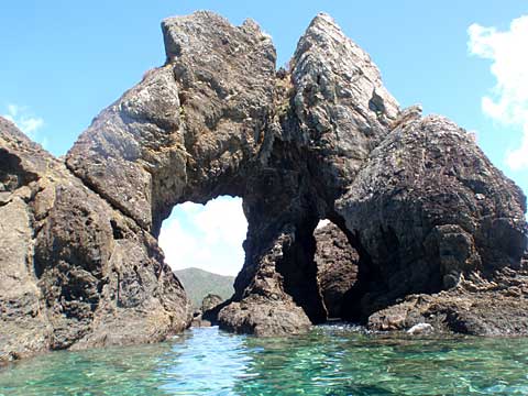 珍しく貫通岩を発見するが、水路狭くて通過は無理(諸鈍湾口)。
