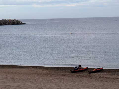 すると、ポリ艇の集団が岩場にきていた。近くの網代港から出てきたカヤック体験のツアーらしい。挨拶だけ済ませて先に進む。網代の漁港の防波堤を内側から抜けるが、今まで漕いできた場所の水質がグッと落ちてしまったので閉口する。そのまま港に隣接した海水浴場に上陸。12時過ぎである。無事ツーリング終了。