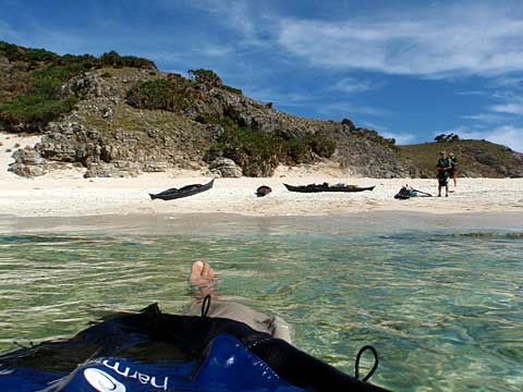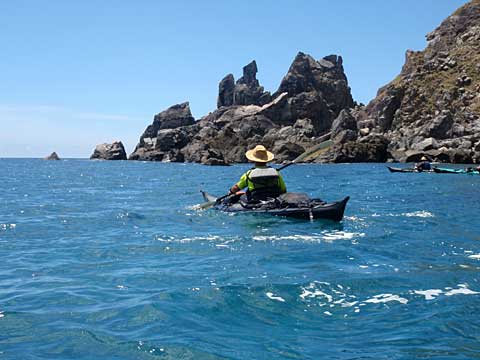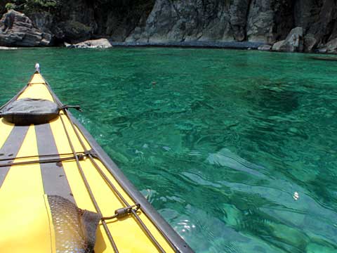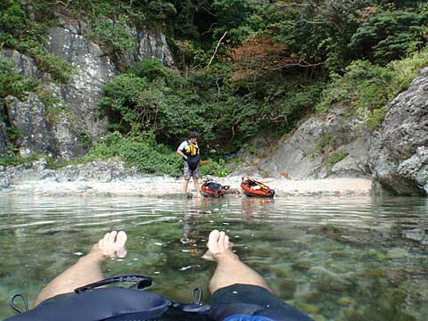 まず東の洞門と西の洞門をカヤックでくぐる。迷路のようなロックガーデンを彷徨い、居組の港近くの島でいったん上陸して腰を伸ばし、泳ぐ。