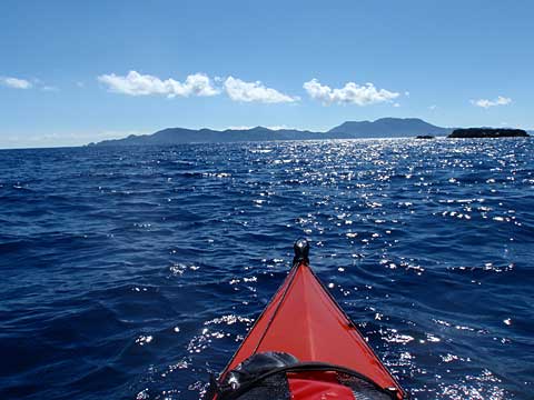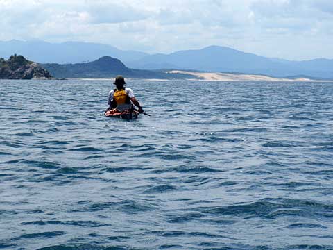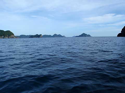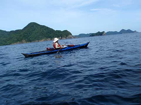 前の晩に歓待してくれた方々に見送られて、大島海峡を東南方面に向かう。漕ぎ始めてすぐ、海上にウミヘビ発見。出艇時にも遠くでウミガメが泳いでいた。猛毒と聞く海ヘビは怖いが(実際はおとなしいらしい)、南国ムード全開である。