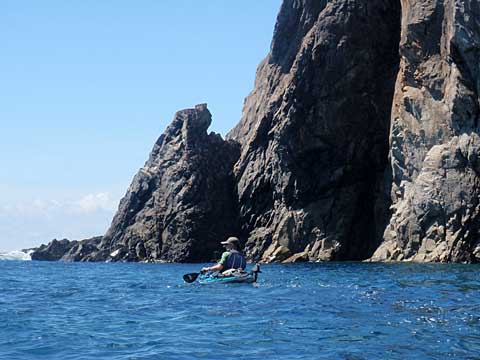 北東風がやや強めに吹き、崖近くでは少し乱れた波が立つが、カフナならむしろそのくらいの方が刺激があってよろしい。なるべく岸ベタで忠実に海岸線を辿り、見つけた洞窟や岩の間の水路には丹念に入ってみるが、あまりに多すぎて、写真を見てもどこがどこに相当するのか不明なものがあり、また岩が入り組み過ぎていて、実際漕いでいて何気なく通過してしまったところに見どころ(カヤック突っ込みどころ)があったりして、事前に直線的に測った距離よりも相当長く漕いでいる。