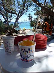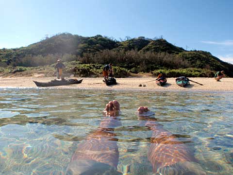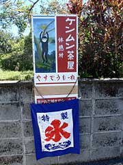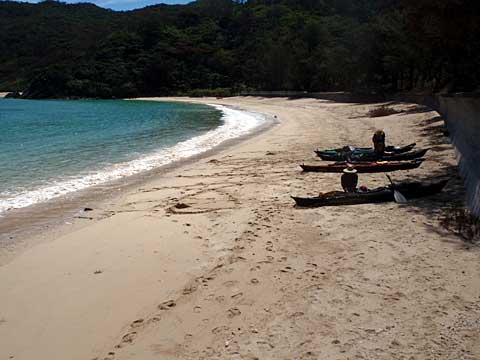 前夜の影響で体調がすぐれないカサハラ氏の休憩を挟みながら、リーフに囲まれた中間点の徳浜に上陸。ここで長く休憩する。ケンムン茶屋(ケンムンは妖怪のこと)でかき氷など注文して食べていたら、福岡からきたという子供たちが引率されて来て、シュノーケリングを楽しみはじめた。カヤックに興味のある子がいくつか質問してきてくれて(特にビルジポンプが気になるらしい)、中年のおじさんとしてはとても嬉しい。