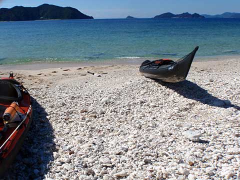 請島水道で若干の流れを感じ、大島海峡でも流れを考慮して進路を北にとった。とはいえ、核心部はカヤックを引っ張っての島越えだった。一日で最も暑い昼時にこの重労働をし、スポンソンの空気はあらかじめ3分の1ほど抜いておいたのだが、あえなく左スポンソンが生間の港で破裂していた。空気を入れてもすぐに抜けるので、大島海峡を漕ぎながら何度か空気をつぎ足してごまかした。でも、ほとんどパドリングには影響がなかった。さすがは安定したカフナである。