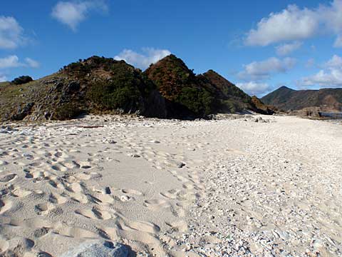 うら寂しい嘉徳の浜。砂の色が違う。