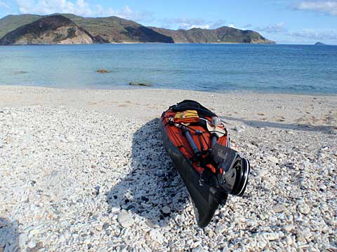 ベース(相棒のカヤック)はより軽いカフナにしたが、トラベルパックに詰め込んだのは、普段常に入れているビルジポンプ・パドルフロート・コーモラントパドルに加え、スプレースカート、PFD、デッキバッグ(その中にシュノーケルグッズとレスキューグッズ少々)、一人用テント・ポール、クレージークリークの座イス、コッヘル・ガスヘッドなどである。すでにそれだけで収納パックはパンパン。予想重量は30kg弱。