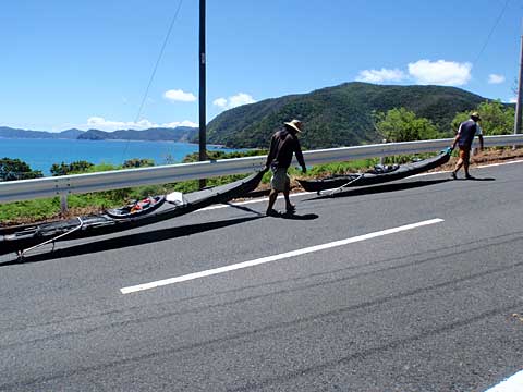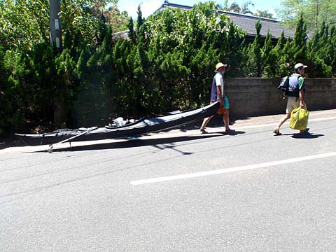 パックカートは2組。二人づつカヤックを運び、残り二人は荷物を運ぶ。