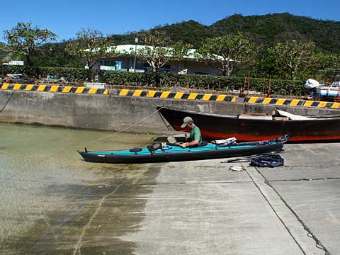 背後の屋根は定期船待合所。裏の日陰で昼食を摂った。出艇準備中だが、スポンソンが破裂していた・・