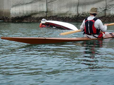 スキンカヤックは沈脱すると全体に浸水するので排水が難しい。すぐに艇が沈んでしまう