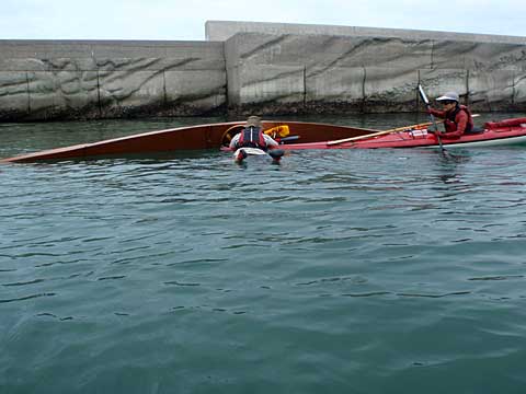 蒸し暑いのでまず左右のロールから。なるべく水がきれいで波の影響を受けないヨットハーバーの隅っこでレスキューの練習。吐月工房夫人のレスキューはかなり久しぶりだそうだ。まずはそれぞれ沈脱して一人で再乗艇する練習だが、近くで吐月工房氏夫妻がやっているのを見て、やはり一人で再乗艇するなら、馬乗り再乗艇やフロートを装着したパドルを頼りに懸垂するよりは、フロートを利用したリエントリーロールが一番確実なのではないかと思った。コックピットに大量の水が入った安定性の悪いカヤックに乗り込んで着座するには相当の筋力とバランス感覚が必要になるからである。最初から着座姿勢で起こしたほうが、排水時のバランスにだけ集中できるのでメリットは大きい。