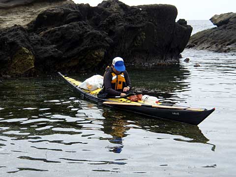 海況は風(北風)も弱く波もほとんどない好コンディション。剣崎でUターンして、ロックガーデンの間を縫うようにして岸ベタで戻ってくる。カフナは艇長が短いのでこういったところは得意中の得意分野である。水深がたぶん15〜20cmもあればハルをこすらずに通過できる。