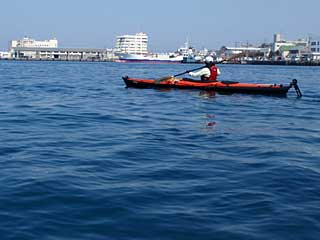 すましと海岸でゴミ拾い。その後海上で大きな肥料袋を拾ったので、試しに両手で掲げてみた。わずかながらも艇が進む。予備パドルを袋に突っ込んで掲げてみても同じだ。スプリットセイルのようなV字型の骨組みにこういう丈夫なビニール袋をかぶせるだけでも帆の代わりになるのではないだろうか?(肥料袋を掲げた写真はこちら)