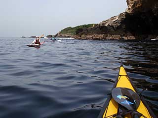 出艇は9時20分。大潮の干潮なので岩場をかなり先まで行って漕ぎ始める。岩陰から出たら風速5m前後の向かい風になった。漕ぎ進めるにつれ飛沫がスプレースカートの上にかかってシーソックの中まで浸水してくる。シーソックもぼろぼろで買い替えたいのだが、スプレースカートもかなり撥水性が落ちているようだ。