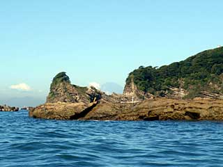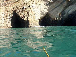 浮島の洞窟前。ここも濁。再び漕ぎ始めたら、右のスポンソンの空気が抜けていた。バルブをきちんと締めずに右スカリングをやったためだろうと思い、傾城島脇で北東風を避けながらシーソックをあけ、空気を入れ直す。スポンソンに穴が空いているわけではなさそうだった。