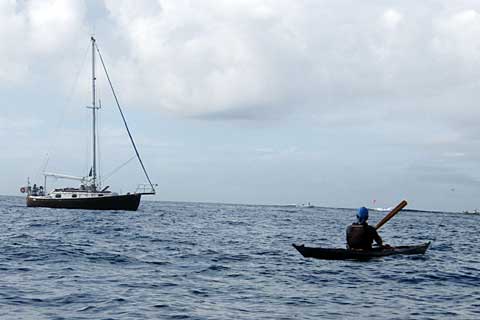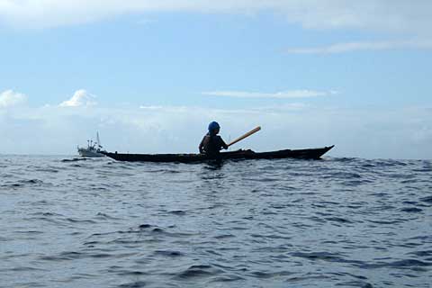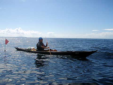 三崎港への西の入り口近くでトラディショナルカヤックを撮影してみる。確かにロッカーが弱まり、バウもスターンも海水面に近くなっている。直進性はかなり増していると見られるが、その分波頭に突っ込みやすくなっているようだ。