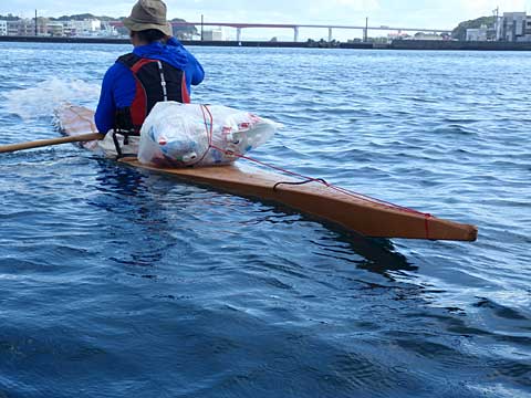 吐月工房氏のカヤックはロッカー(船体の反り)をかなりなくしたということだが、浮かべてみないとよくわからない。ということで満ち潮の、南風の影響でややゴミの浮いた海へ出る。