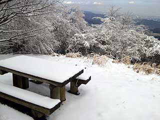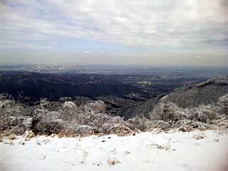 本厚木駅からバスに40分近く乗り、半原の撚糸組合前バス停で降りる。おそらく10時40分ころ出発。神社が目の前にあって、神社の脇の沢の脇道を登っていくと、国道の橋をくぐって登山道になる。まず、705mの高取山へ登るべく登山道を歩く。うっすらと前夜降った雪がかぶっていて、1時間30分ほどで高取山山頂だが山頂部では5〜10cmの積雪があった。登山道は踏まれていて滑りやすいが、特に危険な箇所はなく、アイゼンなしでも登れてしまう。