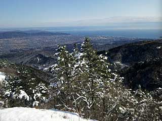 「新東京百景展望地」からは伊豆諸島北部の島々が一列に並ぶ姿が見える。手前から式根島、新島、利島、大島。大島の三原山山頂部も当然白く、遠く富士山やうっすら見える南アルプスも白い。伊豆半島の低山で際立って白く見えるのは大室山だろうか。山腹が樹林帯ならばわずかな積雪で白くはならないが、大室山は草地だから、真っ白になるはずである。