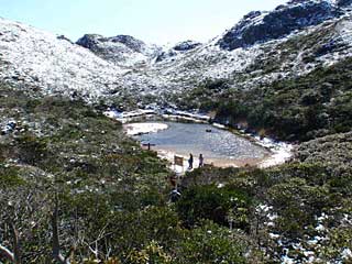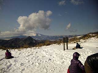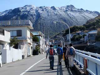 標高570mの天上山トレッキングに出かける。標高0mからの登山なので、高尾山に登るのとはちょっと違う。前浜に面した集落まで来たら、天上山の上部が白い。若人たちは天上山特有の砂礫だと寝ぼけたことを言っているが、それは前日よく山を見ていないからだ。昨晩の冷たい雨はもしやと思っていたが、島民でも滅多に見ないという雪の中の登山となった。