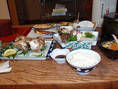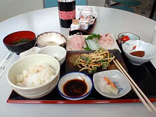 この日の昼食は歩いて港まで戻り、「まっちゃーれセンター」2階の食堂で刺身定食を食べる。結局これが島に来て唯一の海産物を口にした食事だった。