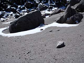 標高300mあたりからわずかに雪が出てきた。稜線直下では5cmくらいか。10合目まで達すると強風なので、千代が池まで降って風をしのぐ。表砂漠と言われる砂礫地ではグレーの砂礫と白い雪のコントラストが面白い。雪の上から足で踏むと、きな粉と砂糖をまぶしたような感じだ。