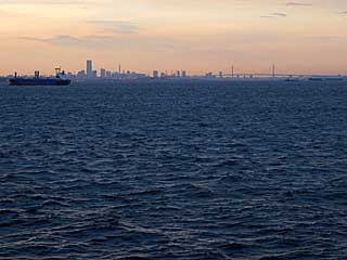 夕方、東京湾に入る頃デッキに出てみる。右舷方向に房総半島南部、左舷方向に城ケ島や三浦半島南岸が見えてきて、いつもカヤックから見慣れた風景があらわれ、何だか安心する。しかし大房岬沖を通るあたりから明らかに水が褐色を帯びてきた。いつもきれいだと思っている房総南部の海水にしてこの色である。外洋の海水がいかにきれいなことか。