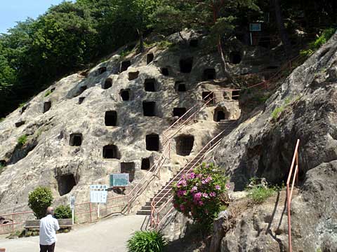袋田駅はログハウスのいい感じの駅舎で、そこから袋田の滝へ向かって車道を歩く。最初に観光地見学から始まった。