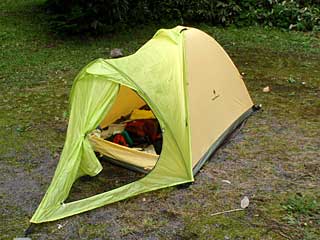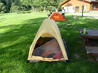 今回、持参したのは亡き友人HBYの遺品のBDファーストライト。透湿性のあるエピック素材を使った黄色いシングルウォールテントだ。ポールがスリーブや吊り下げではなく、テント内部で突っ張るのが特徴。フロア素材がシルナイロンで弱いため、エアライズ用のフットプリントの上に設営する。だが暗い中で慌ててテントを設営したため、1本のポール先端でテントウォールとフロアを傷つけてしまった。アスファルトの上に設営したことも原因だ。気付いたのが夕食を食べて戻ってきてからだったので、小さな穴が空いてしまった。少々ガックリする。