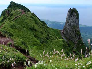 テント設営。ファーストライトのキズが気になる。ここは連泊なのでこの間カラファテで買った前室を装着。快適なわが家になった。貧相な昼食の後、ポン山(444m)に登り、姫沼まで歩く。晴れたのでポン山からの利尻山が素晴らしく、海の眺めも最高である。姫沼までのトレイルはトラバースしながら涸れ沢を何本か横切るルートで、この島にはヒグマがいないから安心して歩けるが、人っ子一人歩いていないのでちょっと寂しいルートだった。