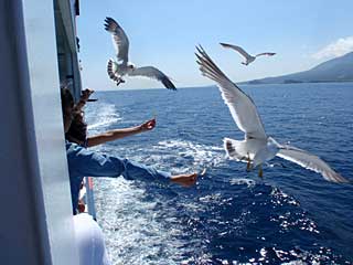 乗客の手から餌をもらうウミネコ