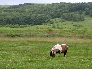 九種湖畔にポニーが1頭いったん宿に戻り、近くの食堂でラーメンを食べてからカヤックを近くの郵便局で送り返す。民宿「ゆうなぎ」は出艇するにもカヤックを郵便局から送るにも30m程歩けばよいのでうってつけの場所にある。「ゆうパック」料金は、局員に食い下がったものの往路の安い料金にはならず、しかしなぜか160サイズに縮んで1,900円だった。