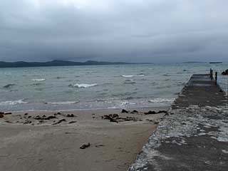ついたキャンプサイトは夏は海水浴場になる入り江に面していて、海水は透明度が高い。サイトは草地で炊事棟と水洗トイレ棟(夏季はシャワーあり)があって最高のロケーションである。山側にはずっと以前に営業をやめて廃虚となったリゾートホテルの虚しい建物があるが、新しい老人ホームの建物もあり、トンネルを抜けると島内唯一の温泉保養センターもある。しかし我々が滞在していた期間は年度末のため、保養センターは閉館していた。ヒマで仕方なければ保養センターの風呂に入って時間を潰す、ということもできない。