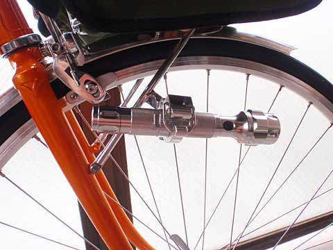 キャリアにはライトステーが一箇所あったので、これも形だけ雰囲気を出すために見合うような懐中電灯を探してネット通販で手に入れておいた。サンジェルマンというメーカーの、「ジェントススーパーXキューブ」というLEDライトである。全体が銀メッキのライトで、単3電池使用、点滅モードもあって照射角度と明るさを無段階に変更できるという優れものだ。このライトをミノウラのアルミ製「ワンタッチクランプ」で挟んでいる。自転車を降りたらワンタッチで外せてハンドライトとしても使えるようにしたかった。