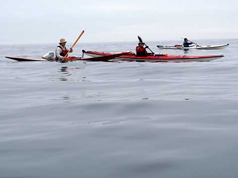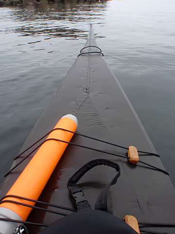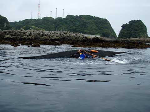戻ってきて、吐月工房氏がこれから網走の道立北方民族博物館へはるばる運んでいくというグリーンランドカヤック(洲澤育範氏作製)に乗せてもらった。コックピットが丸くて狭く、ノーマルの卵形スプレースカートは嵌まらない上に浮力体も入っていないので、かなりグラグラ・こわごわである。で、スカリングレストからスタンダードロール、持ち替えロール、ストームロールをやってみた。1回でかなり水がコックピットから入ってくるので3回目には艇が沈んでいってしまうのだが、ロールは上がった。しかし、足先が狭くて引っ掛かりがないので、バレリーナのように足の甲まで伸ばした格好でのロールになる。レイバックはたやすいが、コースタルツーリングは今の私ではかなり困難。でもカサラノに乗っているせいか、少しは技術も上がっているのかと思えた。