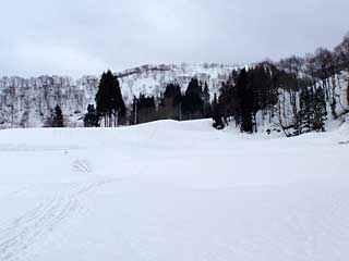 ここから旧笠岳スキー場に繋がるのだが、旧笠岳スキー場も閉鎖されてリフトはない。熊の湯スキー場との境界のロープ脇から進入し、植林が進められている旧笠岳スキー場の中斜面をテレマークで。今日はステップソールなのにきれいにターンが決まる。ボトムは水芭蕉公園になっており、木製ベンチがしつらえてあったのでそこで座って休憩。12時30分。この先は、笠越林道でバス通りまで出てスキーを担いで木戸池方面へ向かう。除雪されていない笠越林道の向かいには広い土地があって、地形図には建物が点在しているように描かれているが、現在は全くの空き地。林道終点まで滑り、角間川を橋で渡って国道をかすめ、幸の湯、石の湯方面に向かう道路沿いの雪を拾いつつスキーで歩く。スキーを担いだまま舗装道路を歩くのはつまらないので悪あがきともいえるが・・石の湯ホテルから小さな尾根を巻いて木戸池ホテルまで出られれば言うことなし。