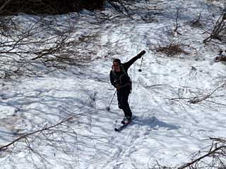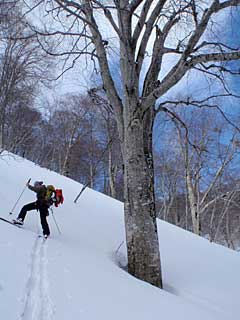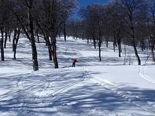 最初は針葉樹の感覚が若干狭い急斜面。下のクラストが引っかかるのできれいなターンはできない。しかし、地形図で登山道の表示があるダケカンバやブナの間隔が広い部分になると、底付きもせず、気持ちよくテレマークターンが決まる。お手付き1回、止まった時のシリモチ1回程度(大転倒なし)で尾根を下りきる。滑走時間は1時間に満たないくらいだ。