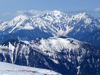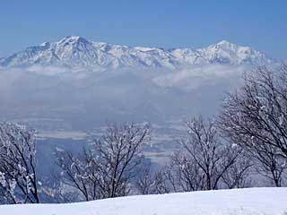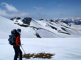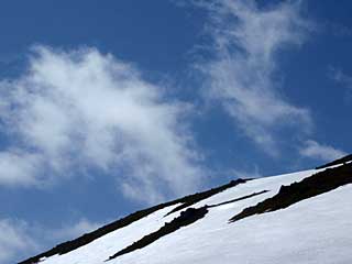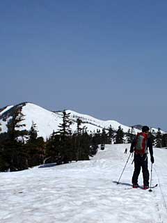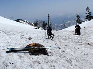 縦溝があって油断ならない大汗をかいたところでザックまで戻り大休止とする。周辺を見渡しても、休日でいい天気にも関わらずスキーヤーがほとんどいない。スキー場からの音楽もここまでは聞こえないので、雪山を独占している感が強い。