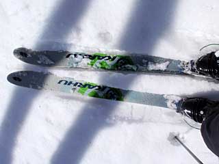 剣が峰今回の板はシャクサン。もう何年も使い込んでいるが、バスへの板の積み込みや最後のツアーコースの汚れ腐れ雪を考えると新しいワールドピステはもったいない。