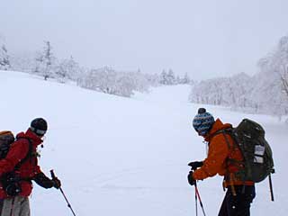 しばらく南地獄谷の源頭部を滑り、シールを装着して光善寺池へトラバース気味に登る。雪で埋まった光善寺池でだいたい14時過ぎ。あとは尾根を滑り、天狗堂の小ピークを北側から回り込んだ。ボウル状の斜面はいままでと違ってガスっていて視界が利かない。まとまって滑りながら(10人以上がそれぞれのラインを取るのでコース取りが難しい)、しだいに前山の滝沢尾根にトラバース。ここまでのコース、あとでGPSのトラックデータを見るとドンピシャであった。さすがインフィールドの中野君である。