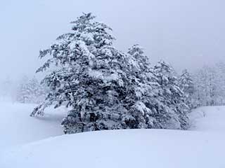 戸隠スキー場のゲレンデトップがもう10時過ぎ。同じく飯綱を目指す山スキー3人組がいた。ゲレンデから鞍部へ滑り降り、飯綱への狭い稜線を前に一本開けた沢を滑る。鞍部へ戻ると先行3人組は飯綱への尾根に乗っているが、スキー登行慣れしていないのか、手間取っていて結局スキーを脱いでツボ足で登り始めた。視界は降雪の割にいいが、新雪が非常に軽くて滑りやすいので、ここでルートを変えて高デッキ方面へ向かうことにした。